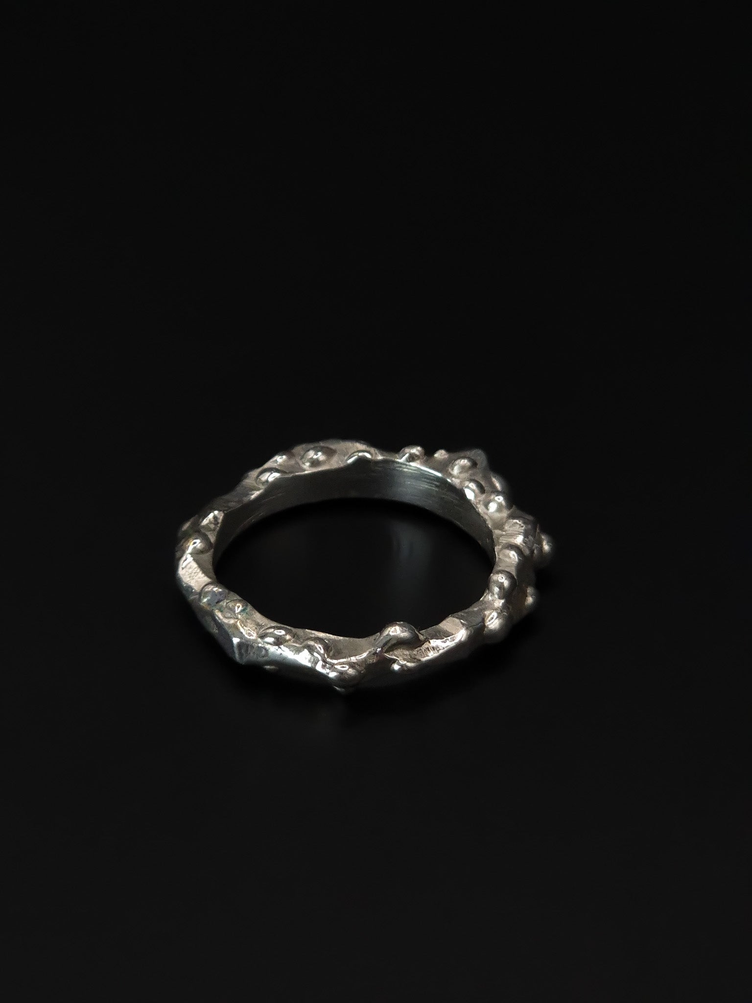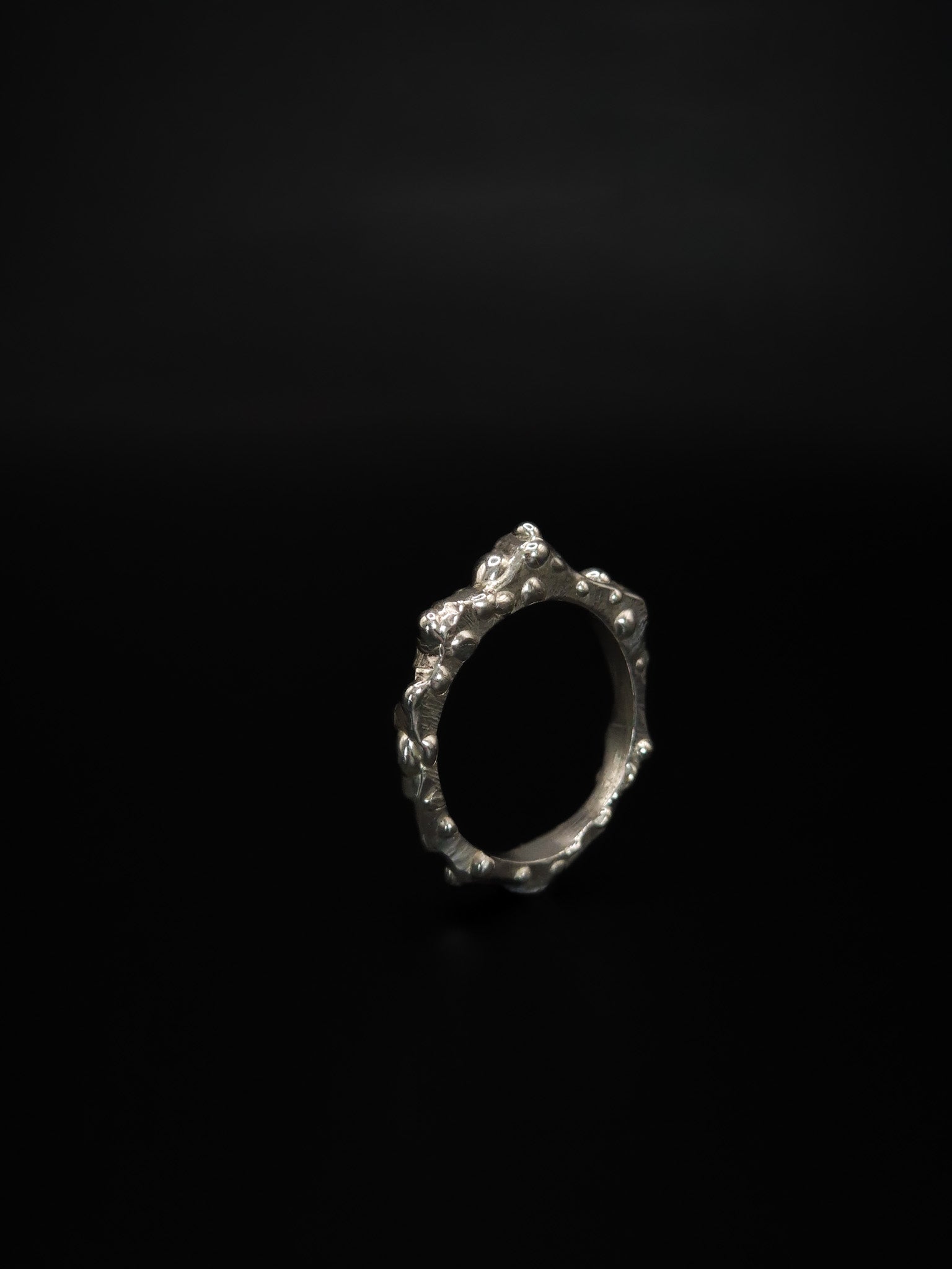 Un anneau d’argent comme une orbite cabossée. Cratère évoque les impacts du temps, les traces laissées par le vivant sur la matière. Chaque creux, chaque bosse raconte un fragment d’histoire.