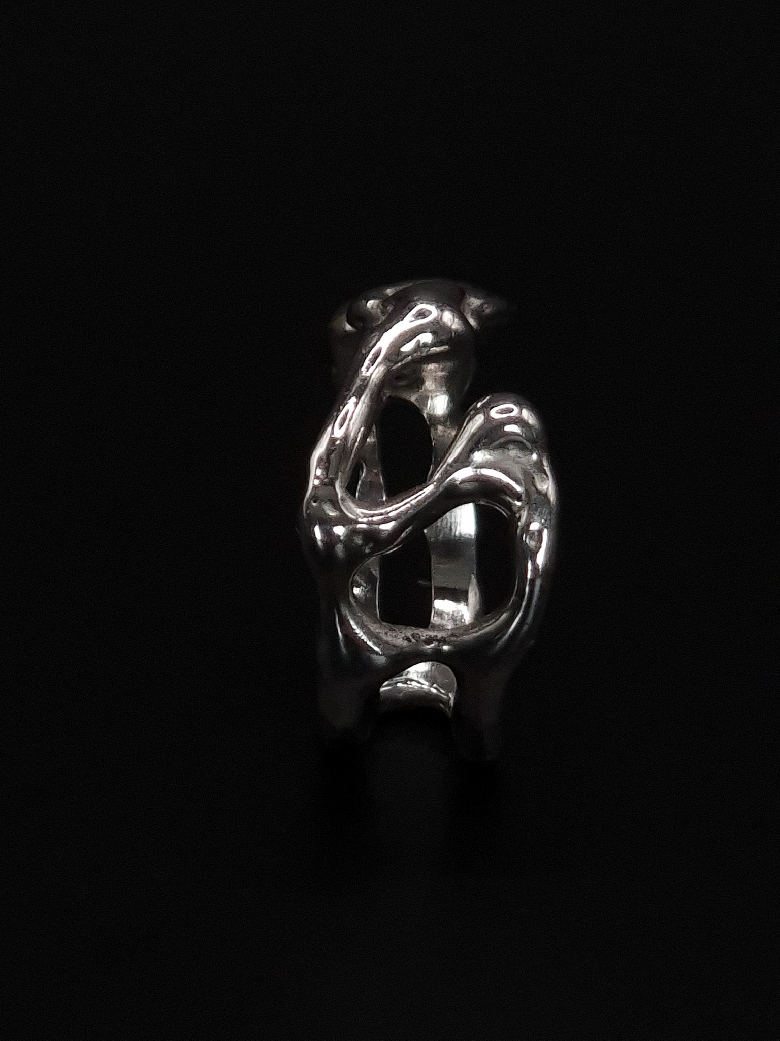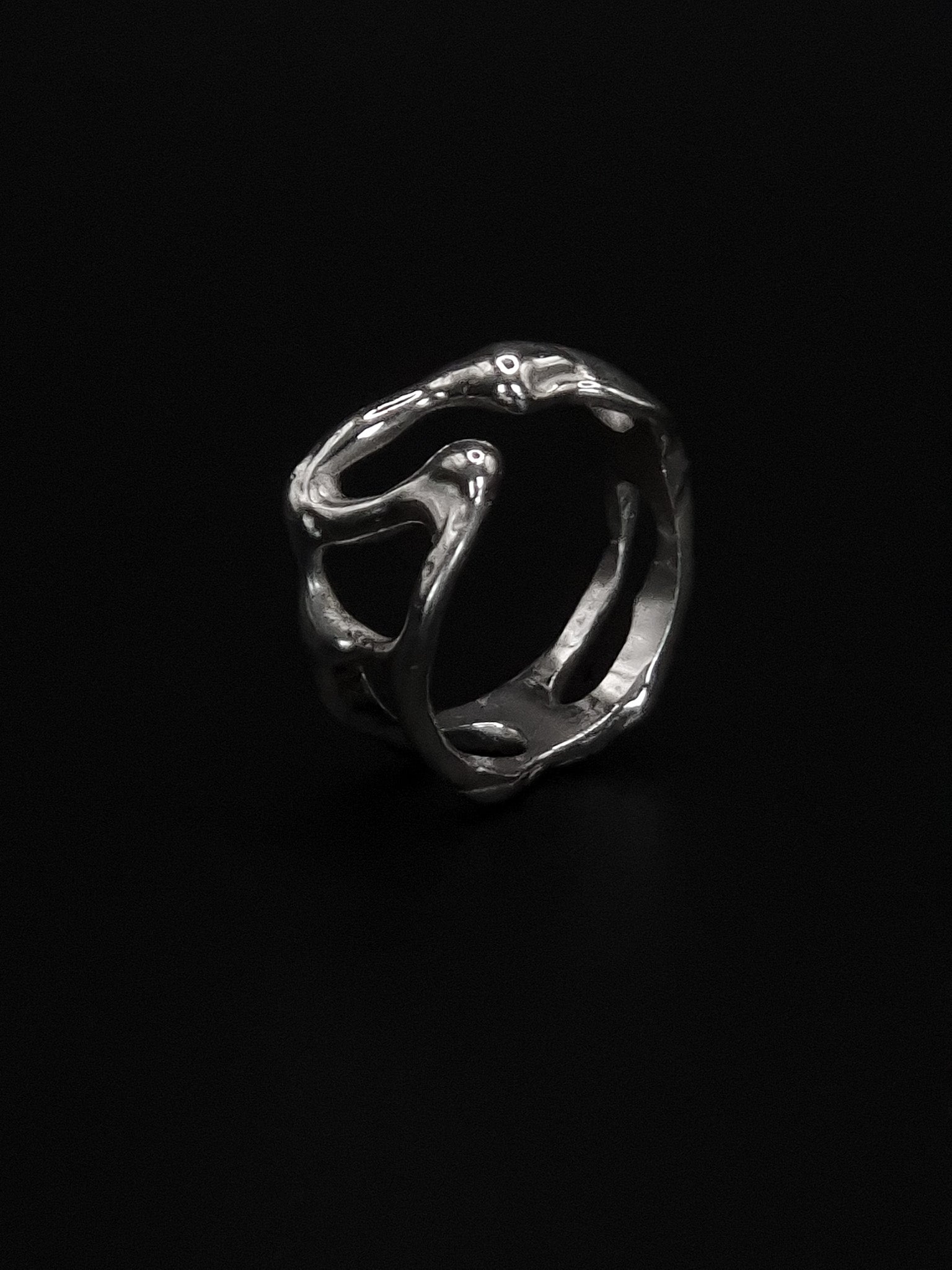 Deux formes se cherchent, se frôlent, se lient. Enlacée dessine une danse fluide autour du doigt, entre abstraction et étreinte. Une bague qui parle de lien, d’élan, de rencontre.