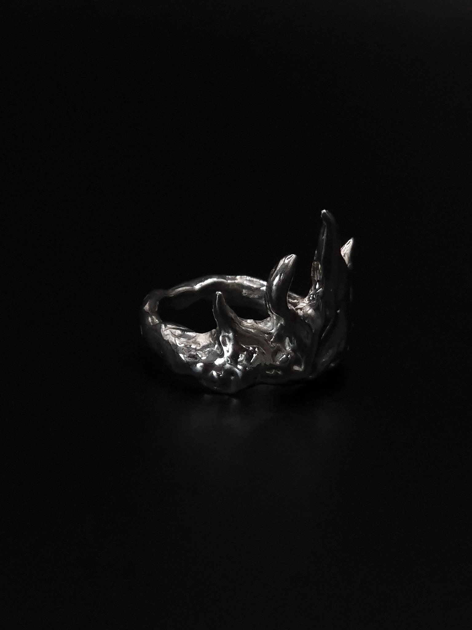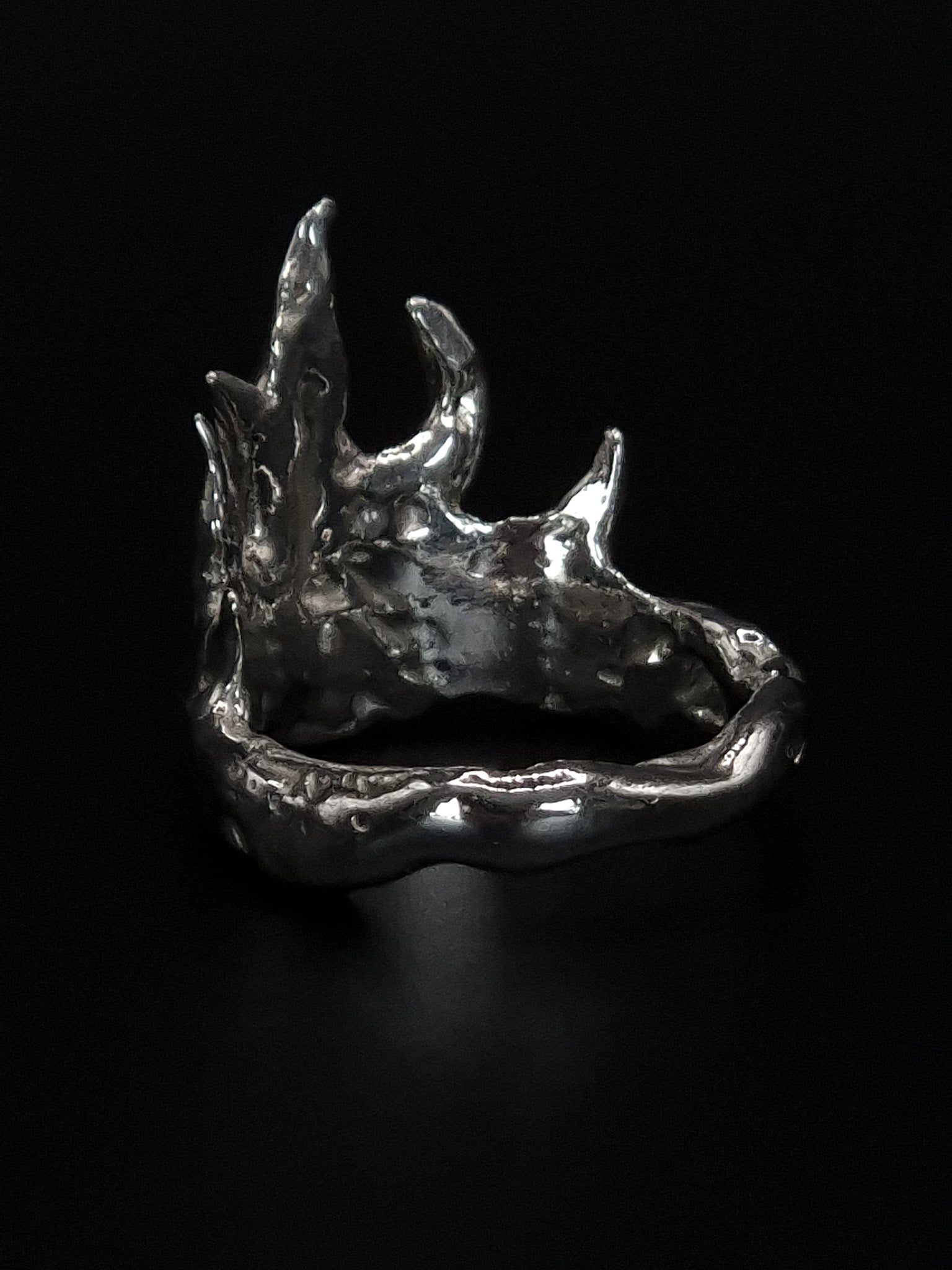 Des pics acérés surgissent d’une base tourmentée, comme un feu figé en plein élan. Flamme Noire incarne la puissance brute, l’intensité sculptée dans le métal.
