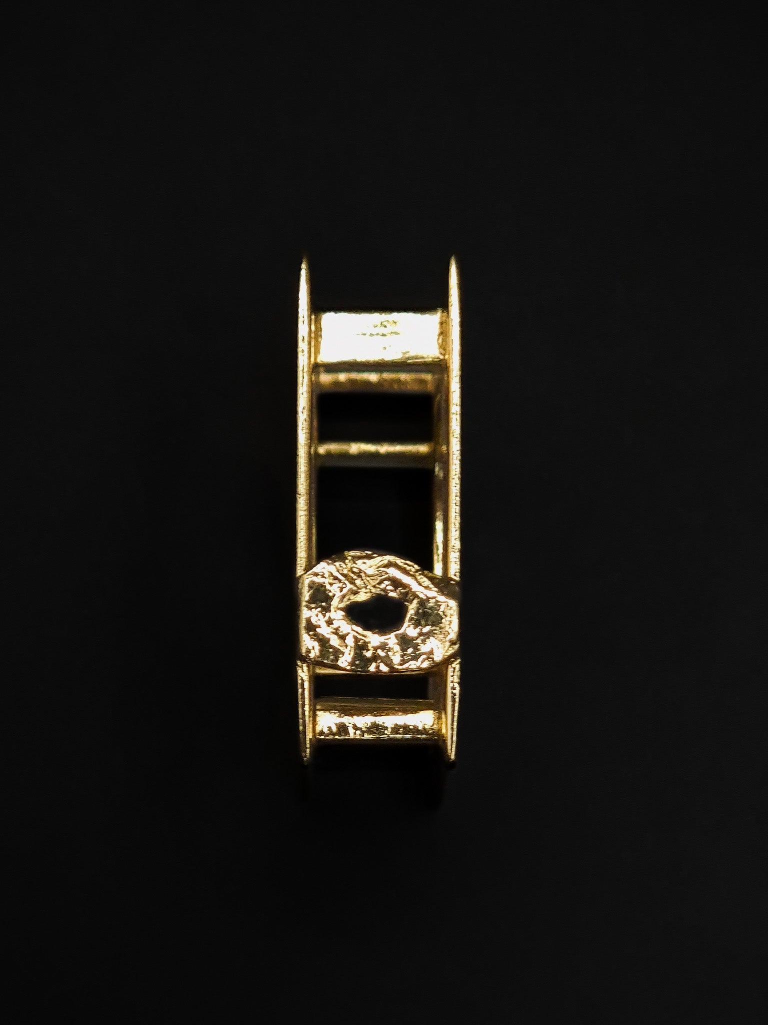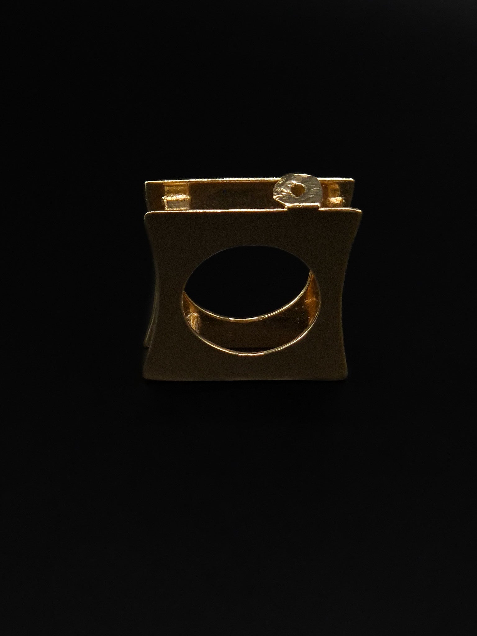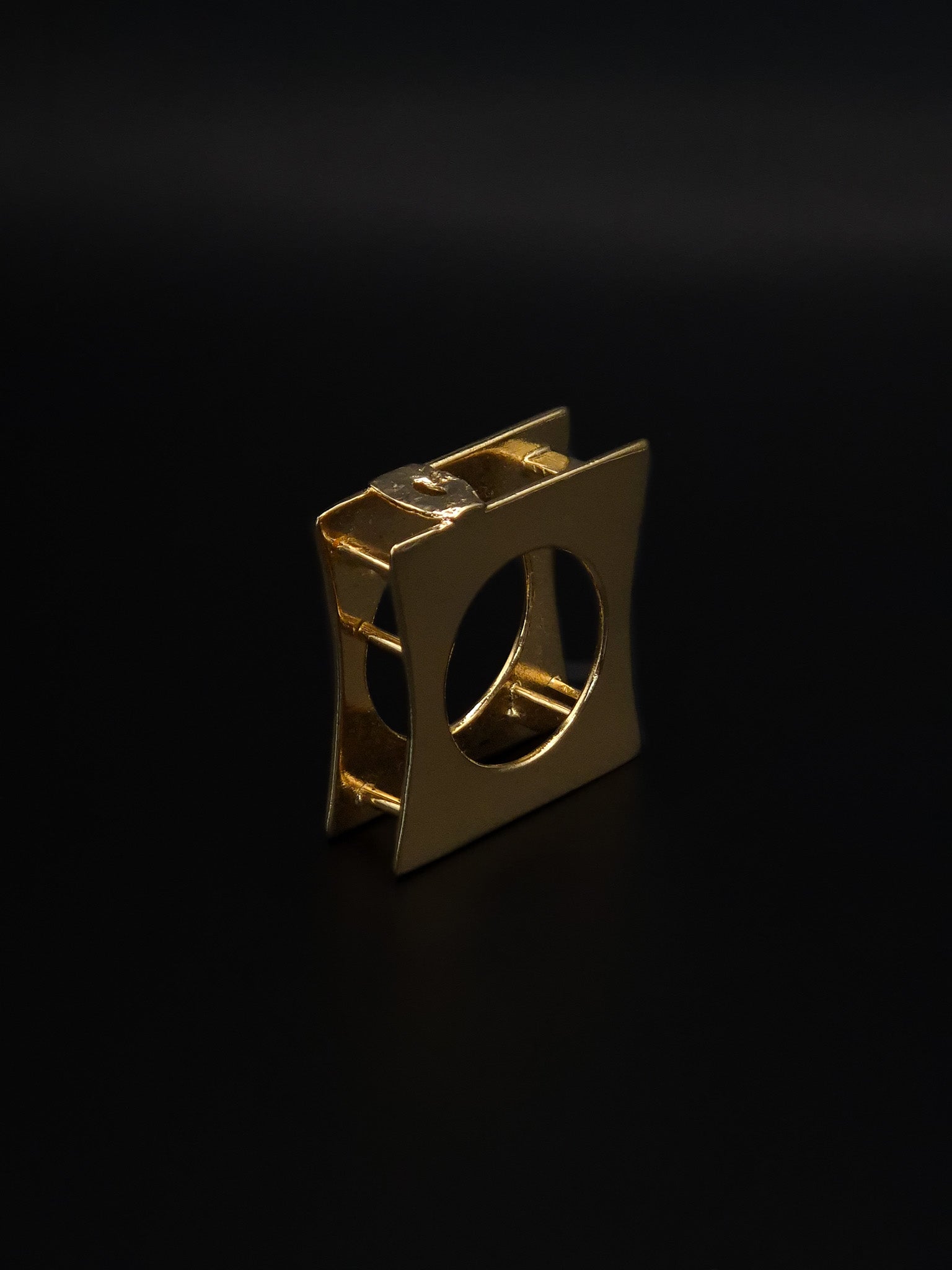 Architecture sur doigt. Totem bouscule les codes avec ses lignes géométriques et son allure de sculpture miniature. Un bijou statement, entre design futuriste et art conceptuel.
